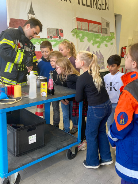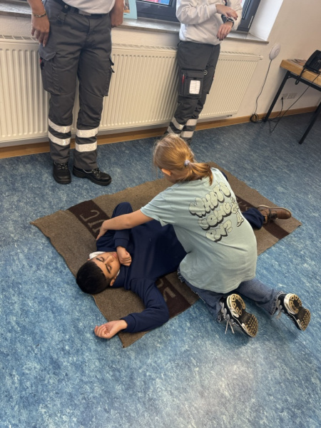 Jede Klasse verbrachte 90 Minuten vor Ort und durchlief verschiedene Stationen in Kleingruppen. Die Kinder lernten, wie man im Ernstfall richtig einen Notruf absetzt, übten die stabile Seitenlage und Reanimation und durften einen Krankenwagen sowie ein Löschfahrzeug von innen und von außen genauer kennenlernen. Zudem staunten die Kinder nicht schlecht, als ihnen Experimente zum Feuer gezeigt wurden. Besonders aufregend für die Schülerinnen und Schüler war, dass sie selbst mit dem Löschschlauch hantieren durften.