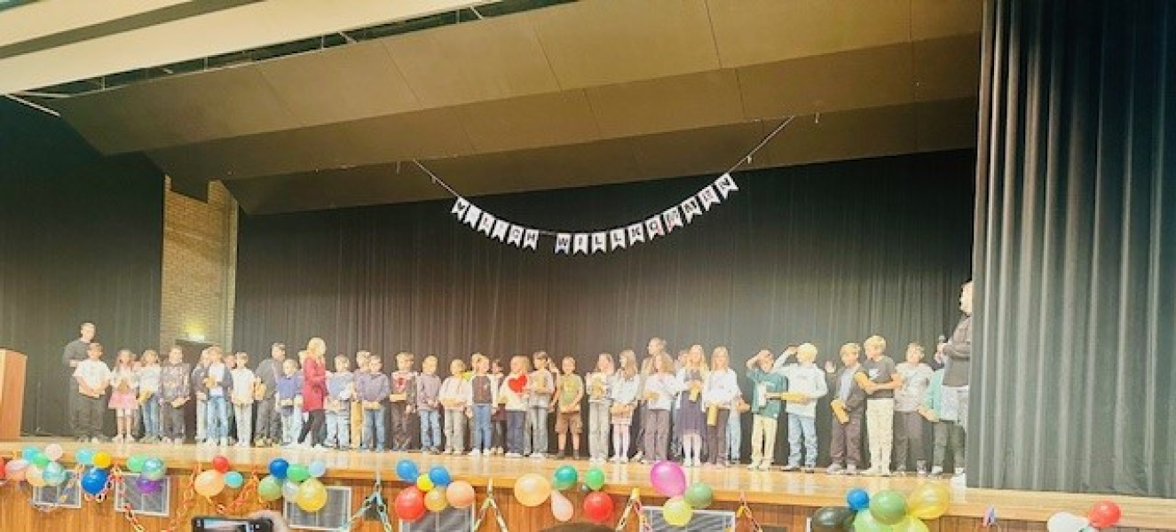 Mit viel Vorfreude stellten sich anschließend die vier Lernbegleiterinnen und Lernbegleiter vor, die die neuen Lernpartnerinnen und Lernpartner als Coaches in diesem Schuljahr begleiten werden. Jedes Kind bekam zur Begrüßung einen Schlüsselanhänger geschenkt, welche die Sechstklässler selbst hergestellt haben und eine Trinkflasche mit dem Logo der Schule – gestiftet von unserem Förderverein. Ein gemeinsames Foto auf der Bühne als erste große Gemeinschaftsaktion rundete die Feier ab, bevor sich die neuen Fünfer mit den Coaches in ihren neuen Lernbereich aufmachten, um den ersten Schultag zu erleben. Währenddessen nutzten Eltern und Begleitpersonen das Elterncafé im Foyer der Stromberghalle, um bei Kaffee und Kuchen mit der Schulleitung und untereinander ins Gespräch zu kommen, erste Kontakte zu knüpfen und Eindrücke auszutauschen.