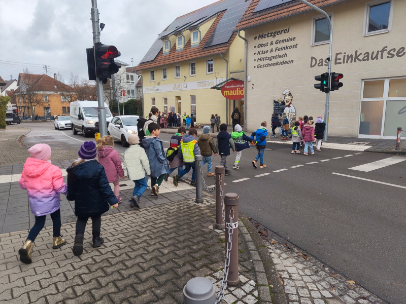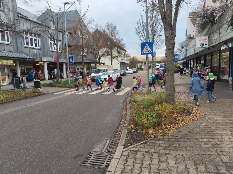 Auf dem Gehweg ging es darum, aufmerksam zu bleiben, Einfahrten im Blick zu behalten und Abstand zur Fahrbahn zu halten. Anschließend übten die Kinder an verschiedenen Stellen das Überqueren der Straße: Am Zebrastreifen mit der bekannten Blickregel, an der Fußgängerampel und an ruhigeren Straßenabschnitten ohne Markierungen. So konnten sie unterschiedliche Situationen erleben und einschätzen.